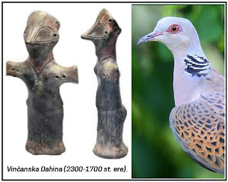 Vinčanska DAHINA čovjekolika figurina pticolike glave grlice, a grlica je vrsta goluba, dakle DAHINA je GOLUBICA. Ime DAHINA je ženski rod, muški rod je DĀHIN i znači VATREN, PLAMTEĆI [6]. Osnova u imenu DĀHIN je srpsko DAH i to je “u drugom prijevojnom stepenu DŪH” [7], tj. ŽIVOT.